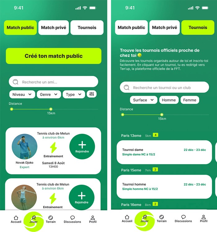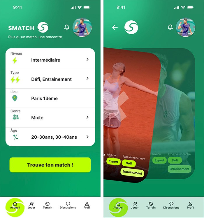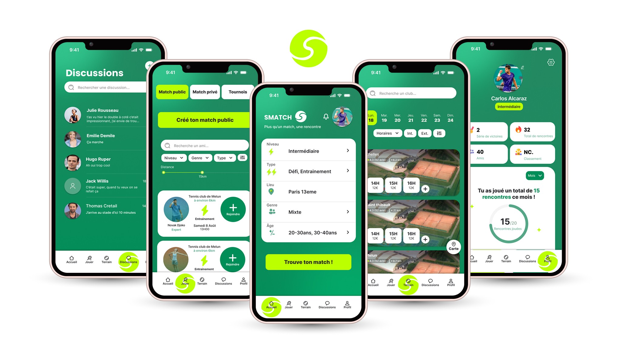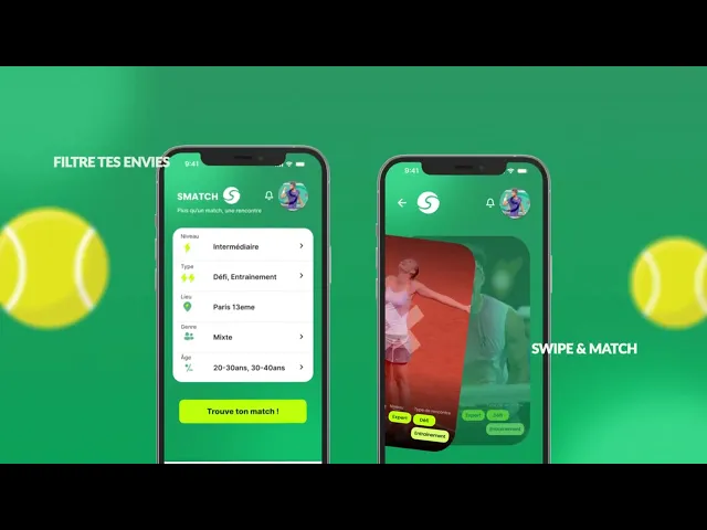 Application mobile pensée pour connecter les joueurs de tennis amateurs. En France, 5 millions de pratiquants jouent régulièrement, mais trouver un partenaire compatible en termes de niveau, de disponibilité et de localisation reste un vrai casse-tête. Smatch s'inscrit précisément dans cet espace : rendre le tennis plus spontané, plus humain et moins dépendant du cercle social existant.